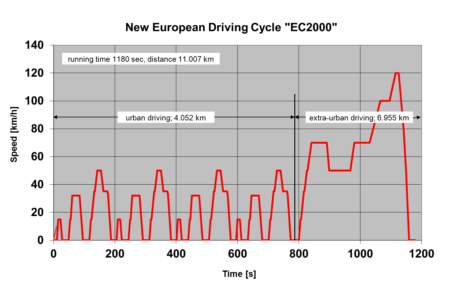 Figuren viser et linjediagram over hastighetsprofilen for kjøresyklusen «New European Driving Cycle». Testen har rundt 4 km kjøring i typisk bytrafikk, og rundt 7 kilometer kjøring i rurale områder.