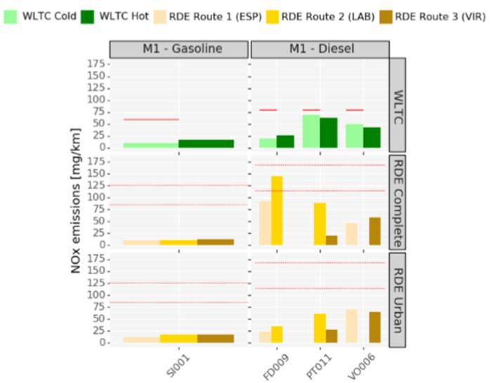 Uavhengige kontrollmålinger av Euro 6d-temp personbiler (en bensin og tre dieselbiler) utført i regi av EU (EUs Joint Research Centre) viste at NOx utslippene fra diesel personbilene synes å ha blitt redusert, se figur 6. Testene er utført i henhold til kravene til typegodkjenning etter 2017 (dvs. inkl. RDE testing), se kapittel 4.