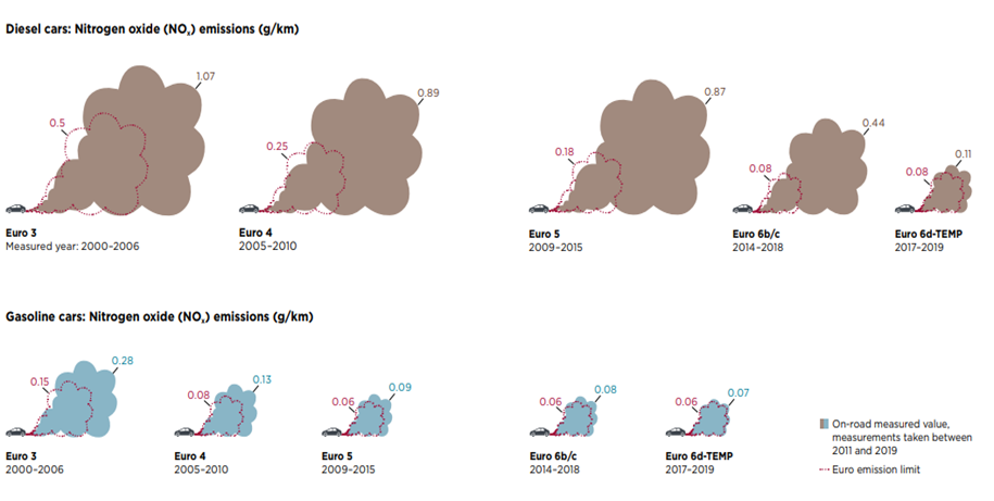 Figuren illusterer NOx utslippet fra ulike Euro klasser av diesel og personbiler. Figuren viser forskjellen mellom utslipp i «virkelig trafikk» i forhold til utslippskravene. Forskjellen mellom faktisk utslipp og krav er blitt redusert med årene.