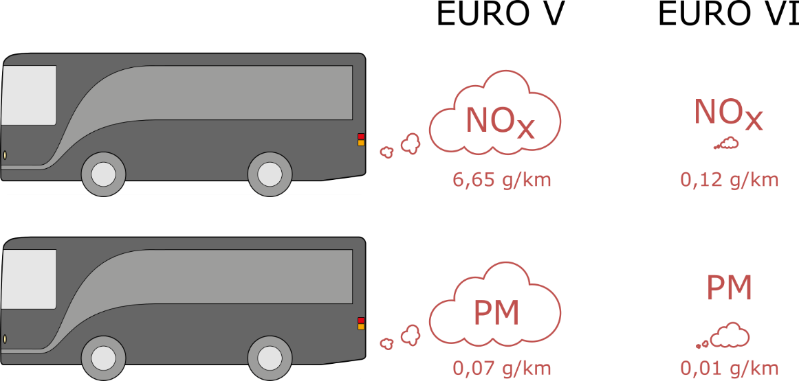 Figuren viser utslippet av NOx og PM fra Euro fem og Euro seks busser. Utslippet markeres som utslippsskyer bak bussene. Utslippsskyen bak Euro seks bussen er klart mindre enn bak Euro fem bussene.