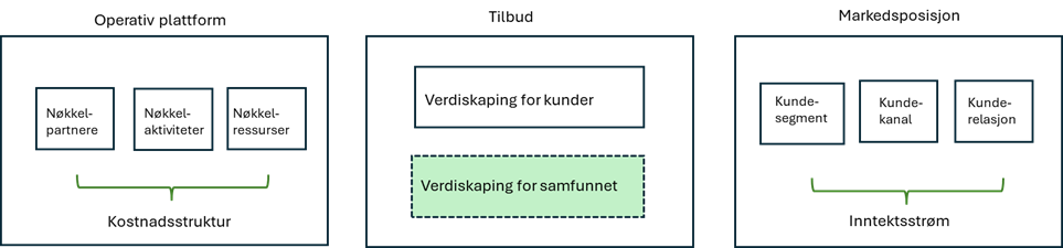 Dimensjonen «Tilbud» (i midten av figuren) er den merverdien samlastterminalen skaper som er interessant for kunder, det vil si det bedriften kan tilby som kundene vil betale for. I denne dimensjonen legger Björklund & Gammelgaard (2023) også inn verdiskapning for samfunnet som går utover den verdien kunden får (eksternaliteter). I forbindelse med godstrafikk er eksterne virkninger vanligvis knyttet til ulemper, sånn at verdiskapning for samfunnet består i å redusere klimagassutslipp, forurensning, støy, arealbeslag og ulykker, samt å øke trivsel og byliv.