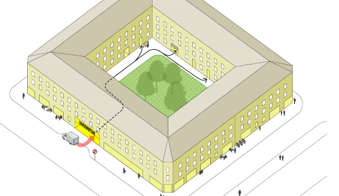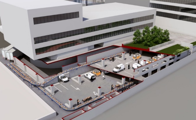Grenier Saint Lazare Urban Hub er et nyere anlegg i sentrum av Paris, se figur 4. Dette er en tidligere automatisk bilparkering som er gjort om til 1600 m2 service- og lagerplass i seks etasjer under bakken, se illustrasjon i figur 4. Anlegget betjener næring og boliger i nærområdet som varemottak og lager. Inngangen er via det lille kiosklignende gule bygget midt på bildet. Det har en losseplass med plass til lastebil rett utenfor.