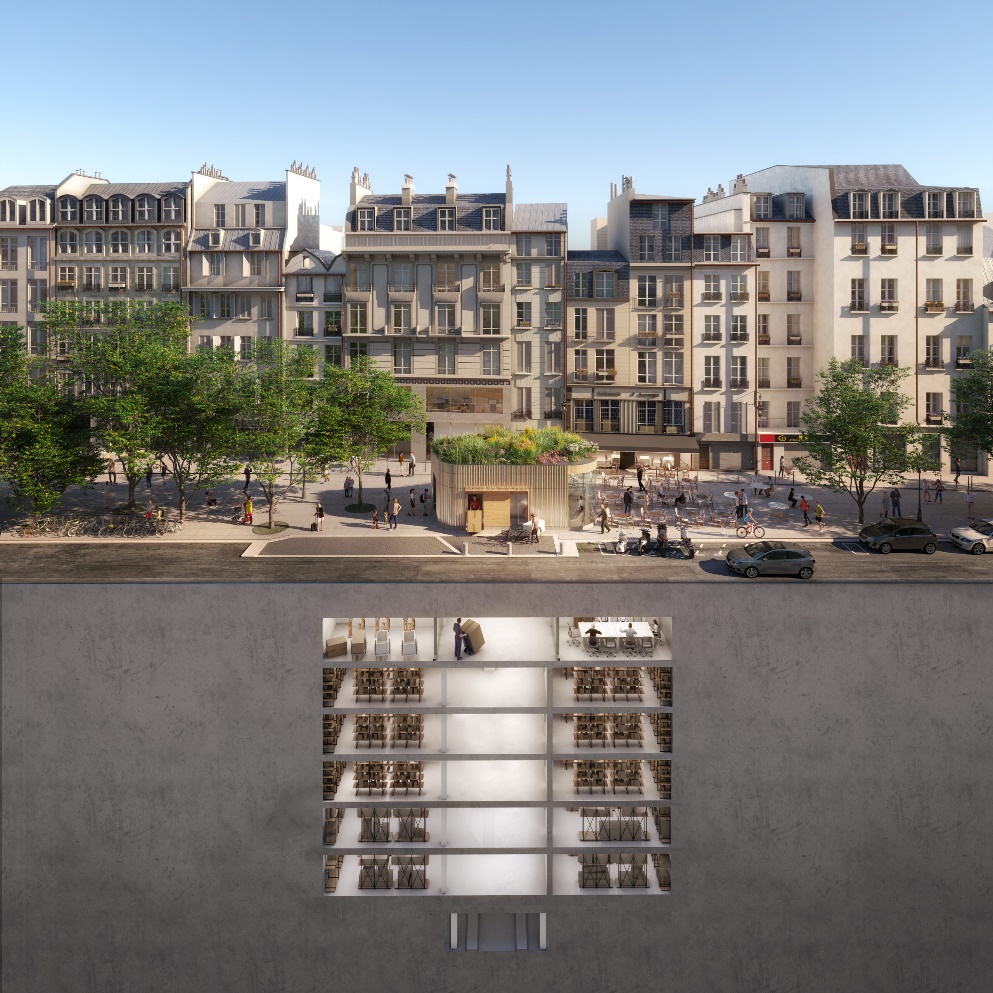 Figur 4: l’Immeuble Inversé ved Grenier Saint Lazare. Illustrasjon MOA: SOGARIS. Arkitekt: Syvil. Perspektivist: Diorama