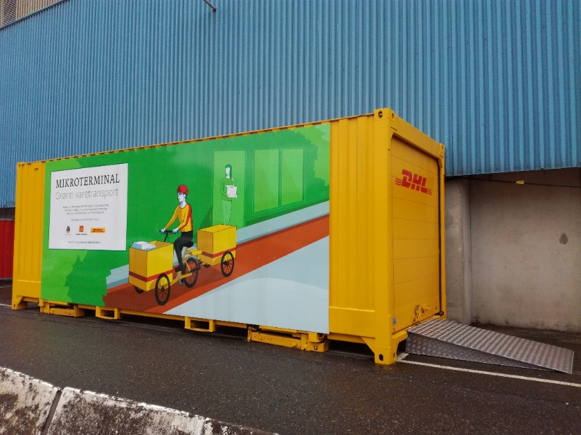 I Oslo startet DHL Express i samarbeid med Oslo kommune og Statens Vegvesen sommeren 2017. Det var et pilotprosjekt der DHL sine varer ble omlastet via et mikrodepot i sentrum av byen, se figur 7. Derfra ble varene videre transportert med elektriske lastesykler til sluttkunde. Mikrodepotet ble benyttet som omlastingslokasjon for varer fra DHL sitt hovedlager på Berger som ligger 28 km fra Oslo sentrum. Varene ble transportert til mikrodepotet ved hjelp av en varebil og ble kun lagret der til lastesykkelen hadde ferdigstilt leveransene for dagen. Ingen varer ble lagret over natten. Lastesyklene ble parkert i containeren over natten.