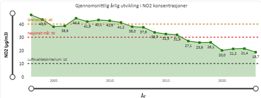 Graf som viser utvikling av NO2-nivå mellom 2003 og 2023.