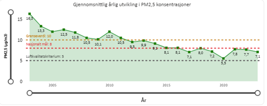 Figur 3. Utvikling i PM2,5-nivå for alle byer samlet. Kilde: Framstilt av Statens vegvesen på bakgrunn av måledata publisert på Måledata | NILU - Norsk institutt for luftforskning
