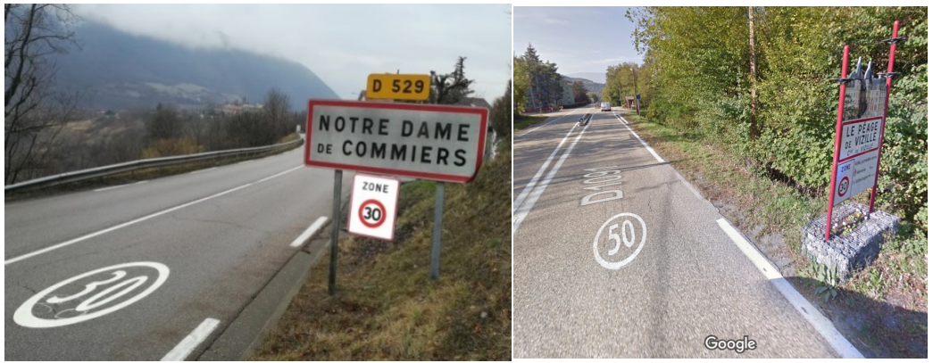 Figur 4: Eksempler på skilting ved inngangen til en kommune i Grenoble. Bildet til venstre viser skilting og markering av en sone med generell fartsgrense 30 km/t, mens bildet til høyre viser skiltingen på en vei med fartsgrense 50 km/t, og som ligger i en sone med generell fartsgrense 30 km/t. Bildene er hentet fra Cerema (2020).