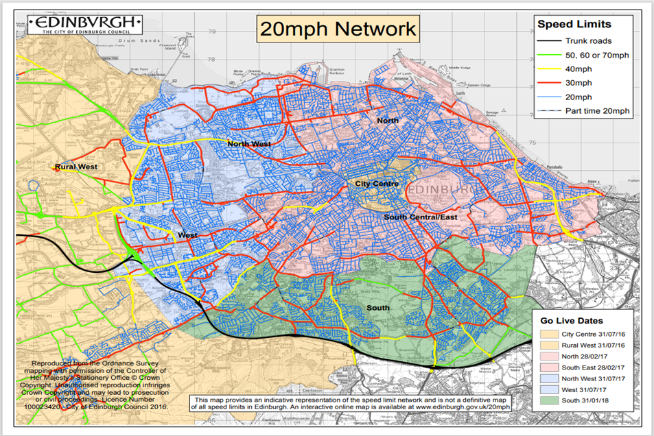Tiltaket ble gjennomført i fire faser, fra mai 2016 til mars 2018. Med dette fikk 80% av gatenettet i Edinburgh fartsgrense 20 mph, og ble den første byen i Skottland med byomfattende fartsgrense 20 mph. Høyere fartsgrenser ble opprettholdt på hovedveier og i gater som forbinder ulike deler av byen, se figur 5. Edinburgh jobber nå med å redusere fartsgrensene til 20 mph på mange av gatene som i dag har fartsgrense 30 mph og til 30 mph i de gatene som har fartsgrense 40 mph (Edinburgh kommune 2024a), se figur 5.