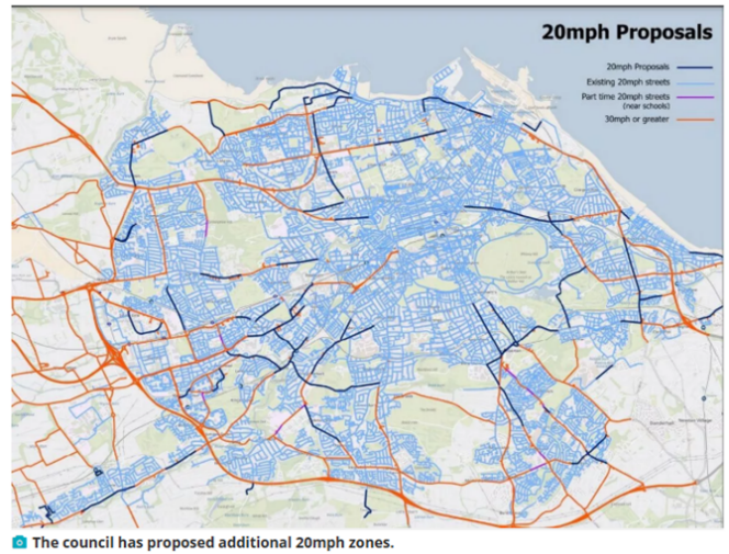 Edinburgh begynte å introdusere soner med 20 mph og fysisk fartsdempende tiltak (i tråd med nasjonale føringer) i 2000, og i 2011 inngikk 50% av gatene i byen i soner med fartsgrense 20 mph (Edinburgh kommune 2019, Jepson mfl. 2022). Kommunen ønsket da å innføre 20 mph i hele byen, men mente det ville bli for dyrt om de samtidig måtte etablere fysiske fartsdempende tiltak.